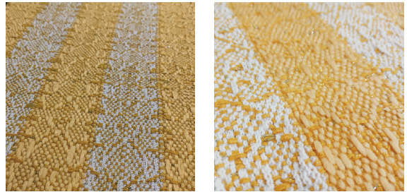 2、经纱选择竹节纱,纬纱以橘黄色和白色银丝结子线间隔排列的方式打纬,采用左右经向斜纹对称的组织,所得面料图案规整,不同花式纱线的交织使面料表面有一定的凹凸感,带子纱使织物更加柔软,结子线使面料上有银丝光泽的结子零散分布,波纹竹节纱增添面料的美观性,色彩搭配温暖和煦,外观别致,适用于制作桌旗、沙发布、桌椅垫、抱枕套、茶巾、夏季地毯织物等,外观整洁,结实耐用,能够给空间增添明亮感与舒适度。