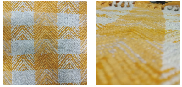 1、以波纹竹节纱和银丝结子线为原料,选择较粗的纱线及特殊的经纱排列方式可使得面料呈现较大的花纹图样,黄色与白色搭配使用,面料成品的手感更柔软,有弹性,美观素雅,配色协调,保形性与悬垂性较好,立体感强,适于制作沙发布、座椅套及桌旗等家居装饰织物。采用毛纤维纱线制造的织物给人带来亲切温暖感,应用于沙发布这类覆盖面积较大的场景时可使空间更加协调,带来触觉与视觉上的双重享受。