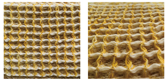 3、以竹节纱和圈圈纱为原料,用蜂巢组织织成的中厚型面料,立体感强,圈圈纱和竹节纱的使用增添了织物的毛型感、凹凸感以及柔软度。成品美观、手感柔软、保暖性好,有类似华夫格的外观,可用作地毯、茶巾、垫子、艺术类装饰挂画等,且面料毛型感极强,可增添环境的温暖舒适氛围,作地毯柔软有弹性,作挂画富有装饰性。