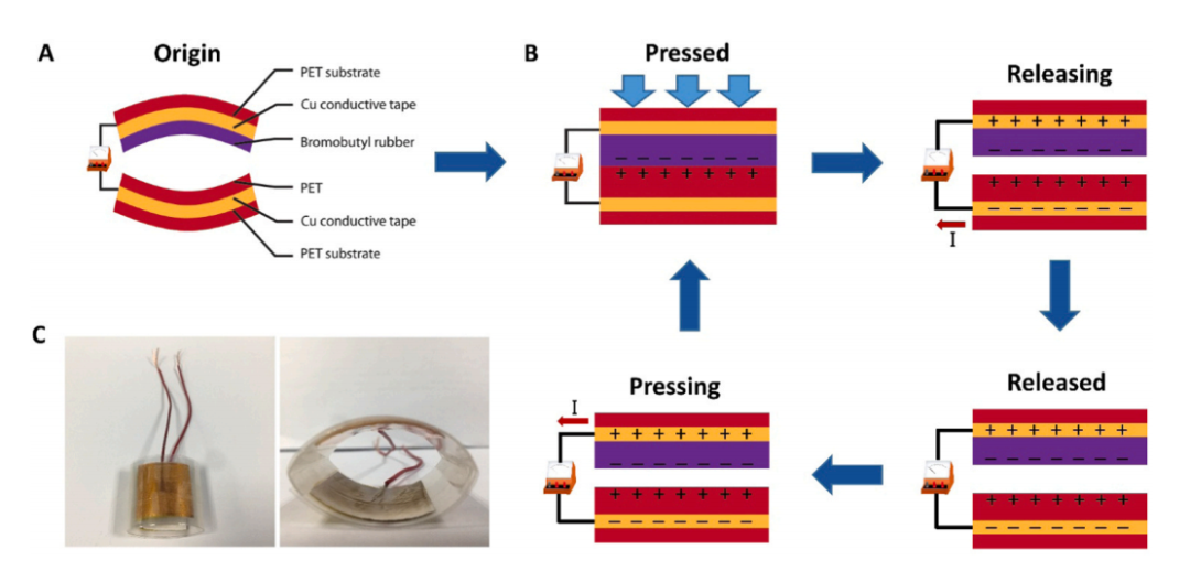 图1 :A)由不同处理方法制备的BIIR和PET薄膜组装而成的拱形接触式TENG的示意图;B)由BIIR和PET膜组装的接触分离式TENG的工作模式示意图;C)用BIIR和PET胶片组装的TENG的实际设备照片。