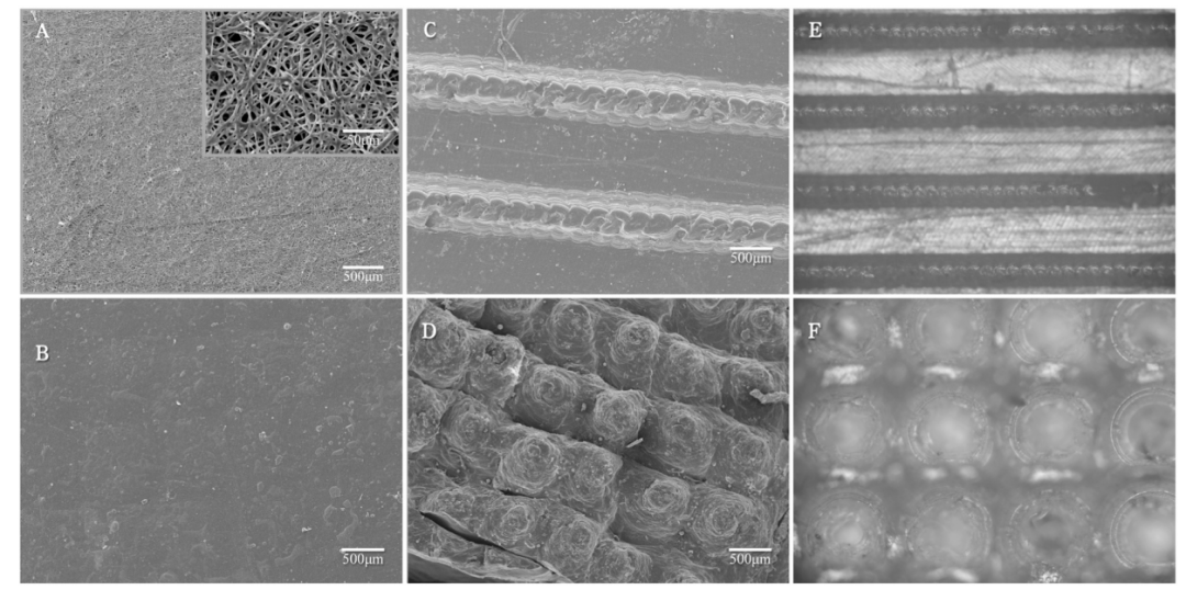 图2:不同方法制备的BIIR膜的SEM图像,A)静电纺丝;B)涂膜;C)具有线形结构的压缩成型;D)具有点状结构的压缩成型;E)线形模具的光学显微镜图像;F)点状模具。