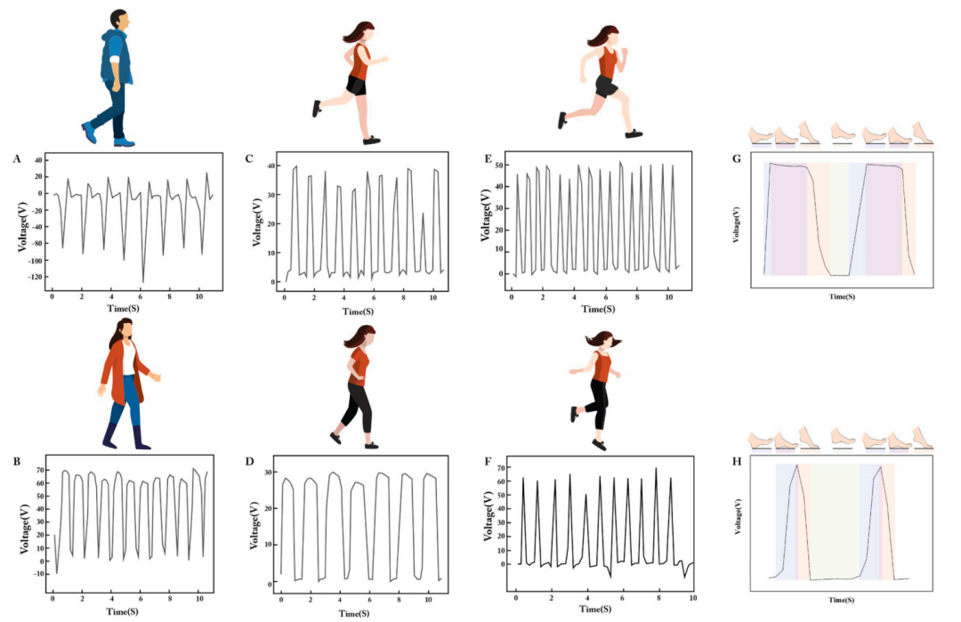 图3、制备好的TENG鞋垫用于身份识别和步态分析,A-B)TENG鞋垫被不同的人用于身份识别:男测试员、女测试员;C-F)TENG鞋垫用于步态分析:轻快行走、慢走、奔跑和跳跃;G-H)当脚步缓慢或快速时,放大检测到的信号。